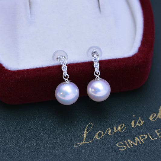 Three Zircon Earrings AAA 9mm Freshwater Pearl Stud